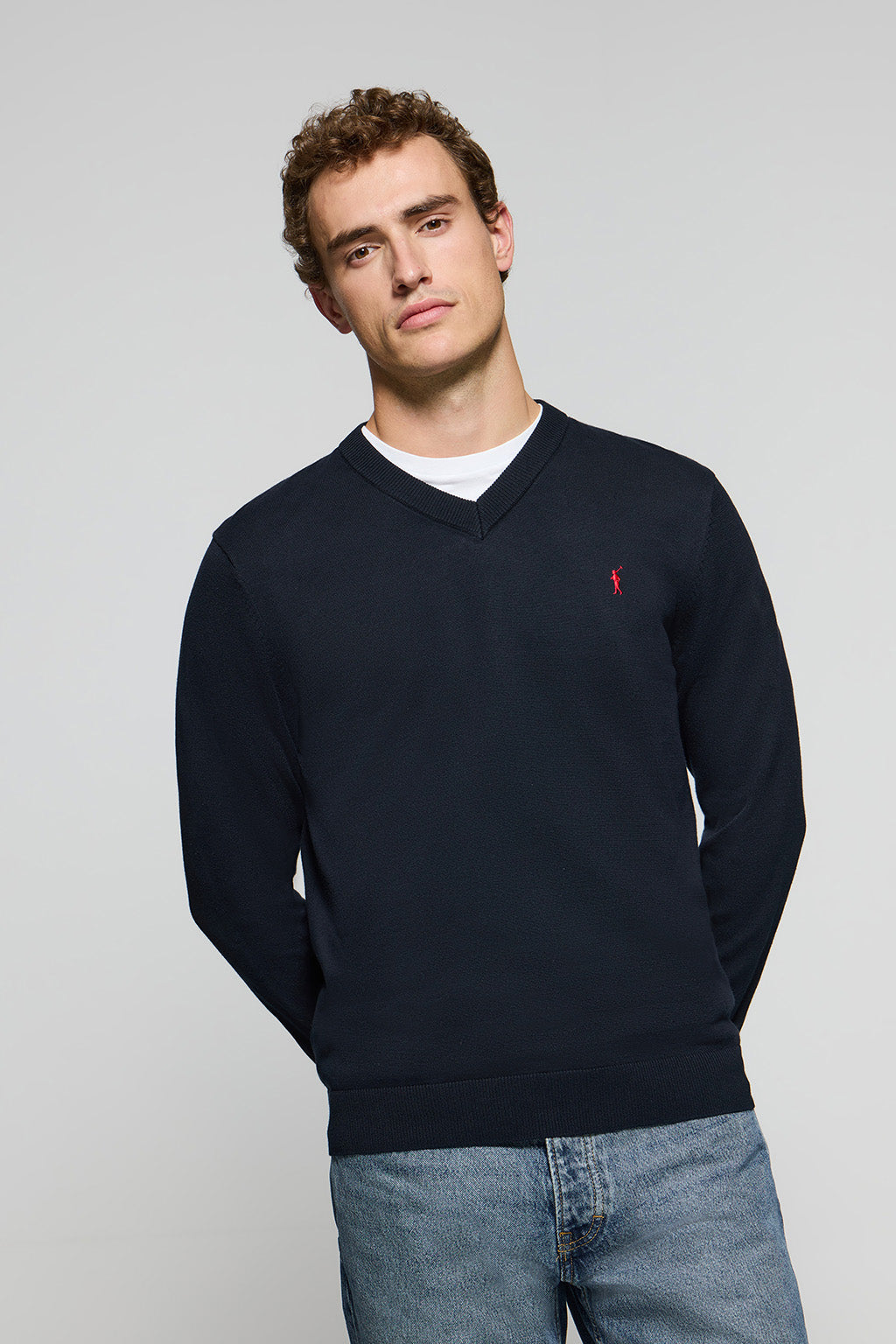 Asphalt grey garment-dyed round neck jumper with embroidered logo