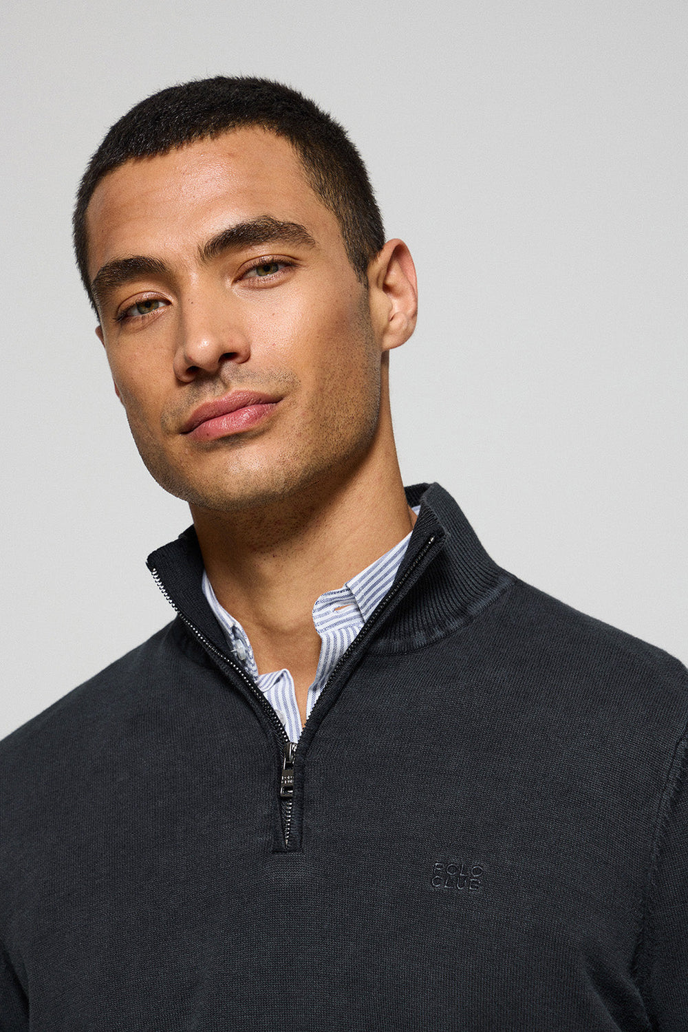 Navy-blue garment-dyed jumper with half zip and embroidered logo