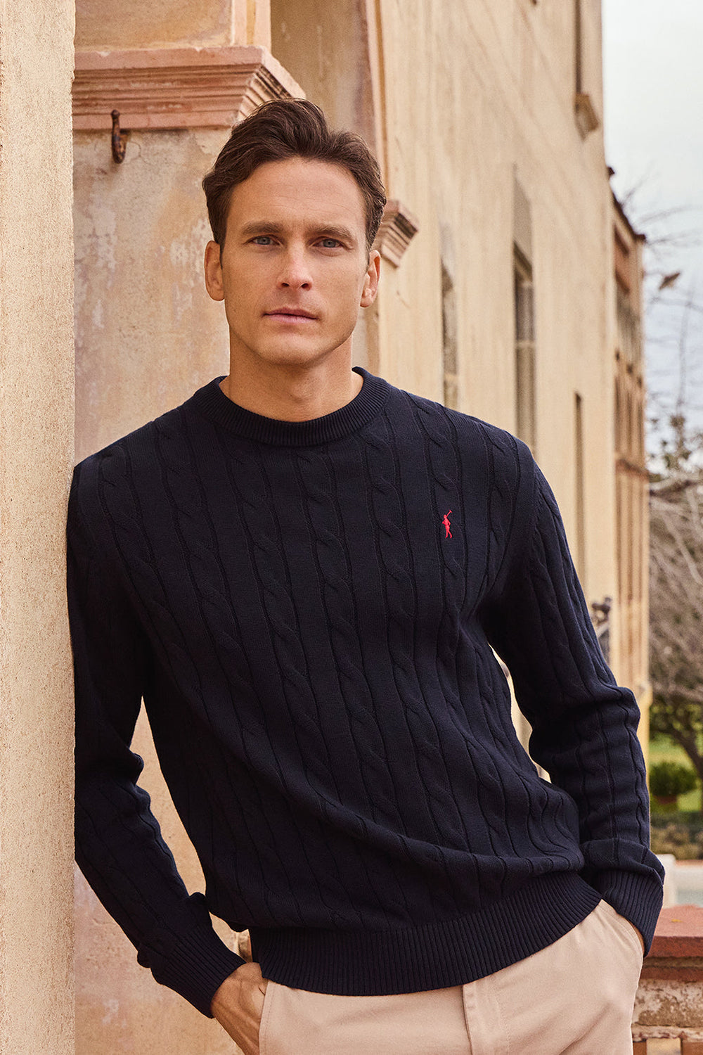Navy-blue round-neck cable-knit jumper with Rigby Go embroidery
