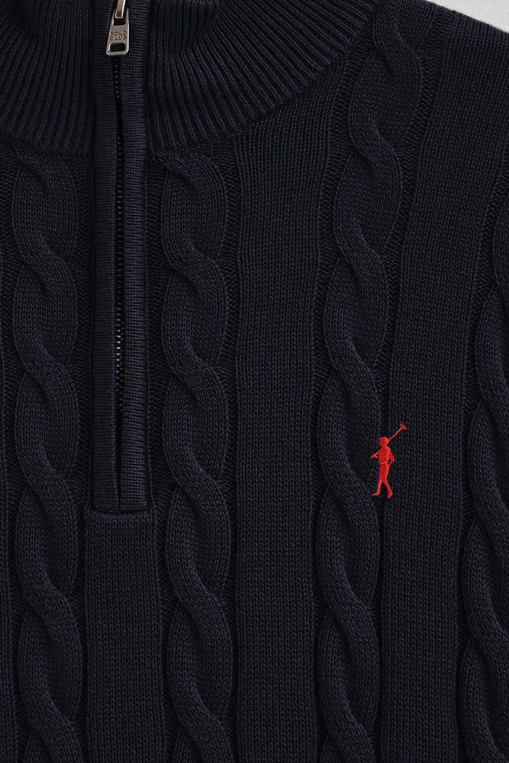 Navy-blue cable-knit wool-blend jumper with half zip and Rigby Go embroidery