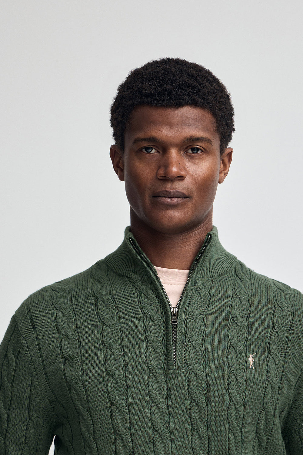Mud-green cable-knit wool-blend jumper with half zip and Rigby Go embroidery